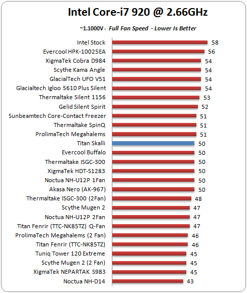 We start the tests with our CPU running at stock voltages (no overclocked). The Titan Skalli lowered the temperature of the CPU at 50 degrees Celsius, matching the good performance of many other models of the category. Compared to Intel's stock cpu cooler, the Titan Skalli will keep your's CPU's temperature lower by 8-10 degrees C: