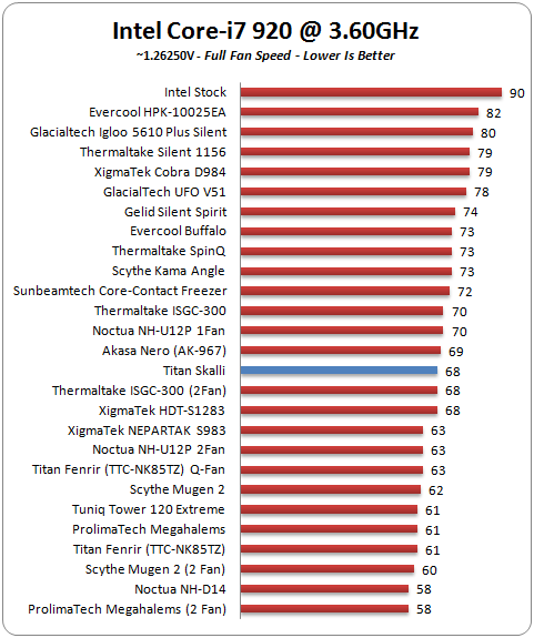 Let's overclock our Intel Core-i7 920 at 3.60GHz. Intel's stock cooler gave us around 90 degrees C, while the Titan Skalli managed to keep the CPU temperature down to 68 degrees C. We got the same performance from the Thermaltake ISGC-300 (dual fans installed) and the XigmaTek HDT-S1283 coolers:
