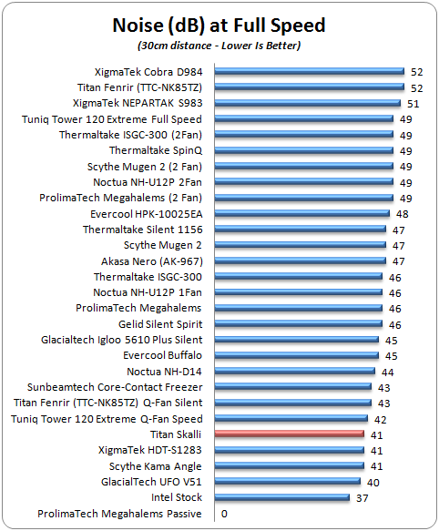 The Titan Skalli cooler is also very quiet even at full speed. It produced 41dB of noise measured at a distance if 30cm from the cooler. That's very close to what you will experience using Intel's stock cooler instead:
