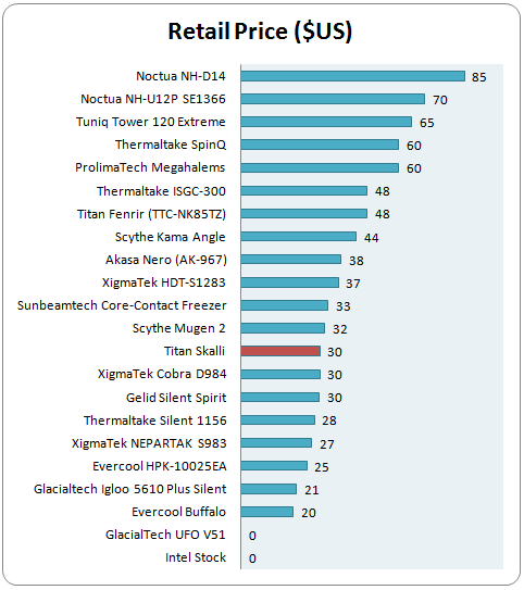 What about price? The Titan Skalli would cost you just $30, making it a very competitive product. It's closest competitors in terms of performance - the Xigmatek HDT-S1283 and the Thermaltake ISGC-300 coolers - are priced much higher. As a result, we have a winner here: