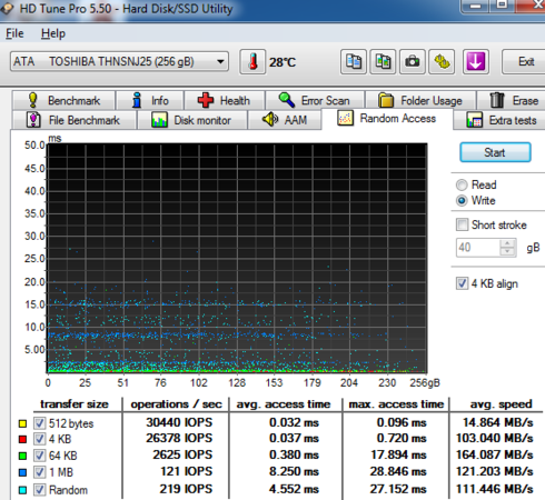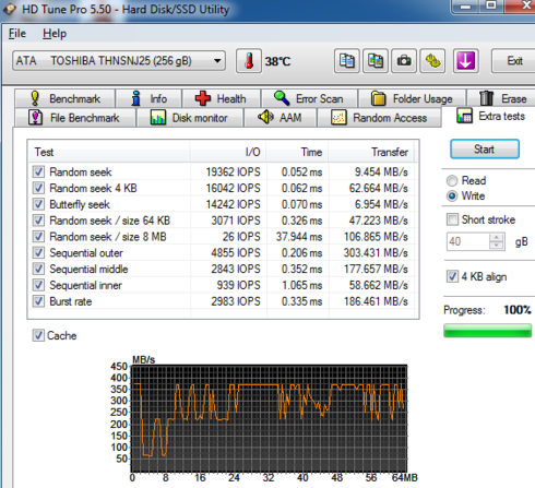 We move on to the HD Tune Pro software, another utility we used to measure the drive's reading and writing performances. Although not necessarily representative of real-world workloads, HD Tune's targeted tests give us a glimpse of each drive's raw capabilities.