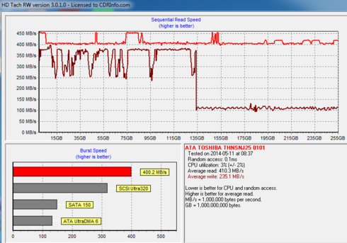 The drive gave 410.3 MB/s and just 235.1 MB/s on average for sequential reads and writes, respectively. As you see in the graph below, the drive's writing performance dropped to almost 100 MB/s after the 135GB mark, lowering the drive's overall average writing speed.