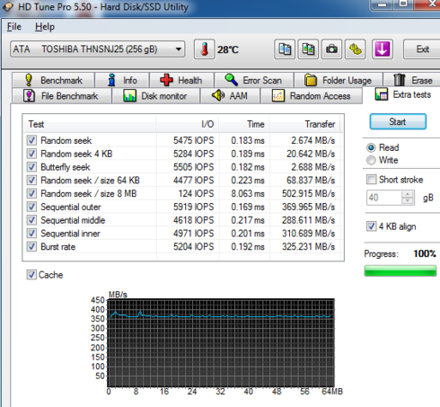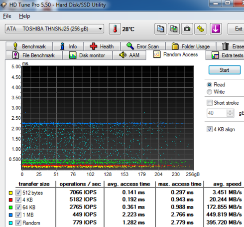 Below you see random reading test, where the Toshiba HG6 256GB SSD gave a 449.819 MB/s average reading speed for an 1MB transfer size and a 395.720 MB/s average reading for transferring files with random sizes - an average performance.
