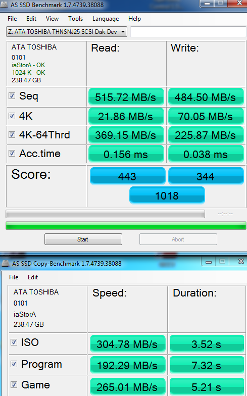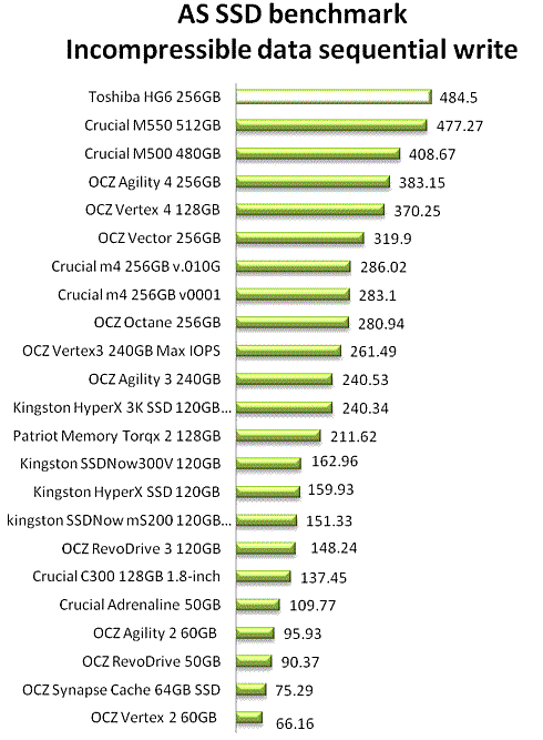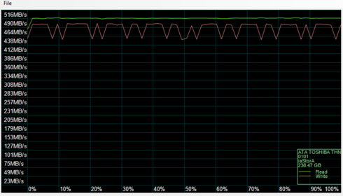 The HG6''s performance in sequential reading with incompressible test was high at 515.72 MB/sl. Its sequential writing performance was impressive at 484.7 MB/s (average). Toshiba has made a great job with the firmware of the drive, offering a performance consistency with all kinds of data: