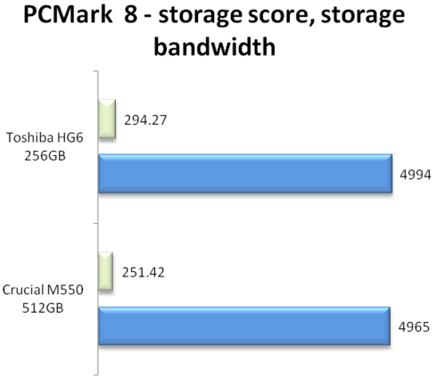 The Toshiba HG6 256GB SSD scored 4994 points, outperforming the 4965 score we have measured with the Crucial M550 512GB drive.