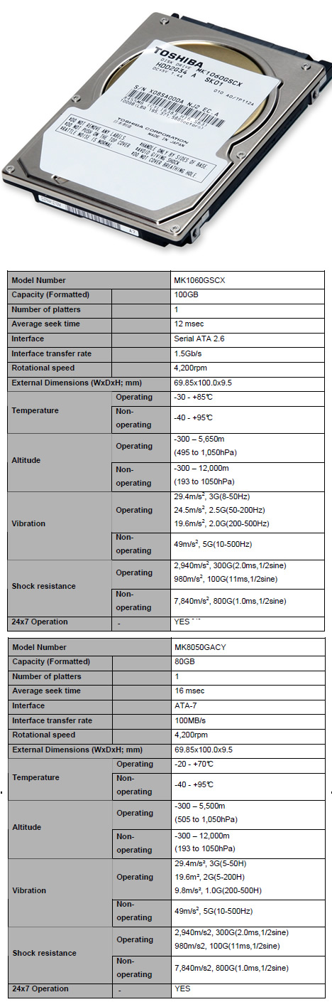 Designed for extended periods of operation, the MK1060GSCX and MK8050GACY feature a "case temperature" range of -15 to +70 degrees Celsius. Both drives also have an expanded operating altitude range and offer better resistance to vibration when compared to standard HDD models.