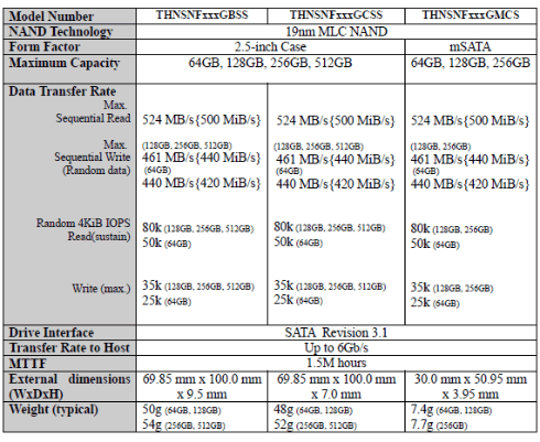 THNSNFxxxGBSS (9.5mm SATA 6Gb/s height, 64, 128, 256, 512 GB), THNSNFxxxGCSS (7.0mm 6Gb/s height, 64, 128, 256, 512 GB) and the THNSNFxxxGMCS (mSATA, 64, 128, 256GB).