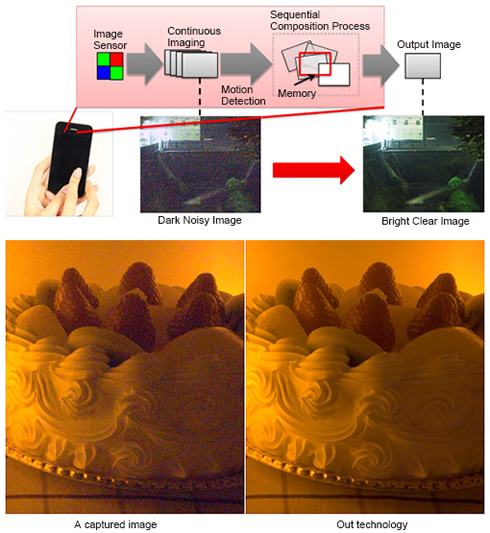 Toshiba claims that its new super high quality image processing technology allows the user to acquire a much higher quality image by significantly reducing noise and preventing camera shake without requiring a large amount of memory. This technology generates a very sharp image with less noise by overlaying many continuously recorded images. By correcting camera shake with our proprietary high-precision motion detection technology, the image is sequentially generated using the memory capacity required for just a single image. This new technology precisely detects everything from tiny vibrations to large camera shake. Random noise is canceled out by overlaying multiple images, and object edges are kept clear and crisp through the same process. The increase in the number of captured images makes it possible to obtain very high image quality using very little memory for storage, which to date has required a highly sensitive large image sensor. In particular, night scenes suffered from increased image noise. Our technology will enable users to produce extremely clear images at low light conditions.