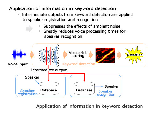 The first feature is the use of the intermediate outputs during the keyword detection for effective speaker registration and recognition. The AI must first detect keywords by separating ambient noise from audio information. Its neural network does this by processing spoken input while absorbing the effects of ambient noise. Speaker registration and recognition are performed using the intermediate outputs of the neural network, an approach that suppresses the effects of ambient noise on speaker recognition, and also reduces the time required recognize the speaker. It secures high-speed operations with constrained resources.
