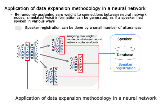 The second feature is the use of data expansion methodology in the neural network. Data expansion is a method for learning from small amounts of data, in this case spoken utterances. By randomly assigning zero weight to connections between neural network nodes, simulated voice information can be generated, as if a speaker had spoken in various ways. Successful identification of individuals is based on the AI learning from their speech samples, and this method recognizes particular speakers even when only a small number of utterances are available. Toshiba has reduced the number of required speech samples to a point where the new AI technology can complete user registration with only three utterances.
