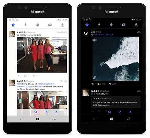 Alongside the Twitter app on desktop and tablets, you can now experience Twitter for Windows 10 on mobile phones. With Twitter for Windows 10 on mobile, you can experience Moments and group Direct Messages; shoot, edit, and Tweet video using your camera; share a Tweet and add your own commentary with quote Tweet; you can follow conversations; and you can check out top Tweets without logging in.