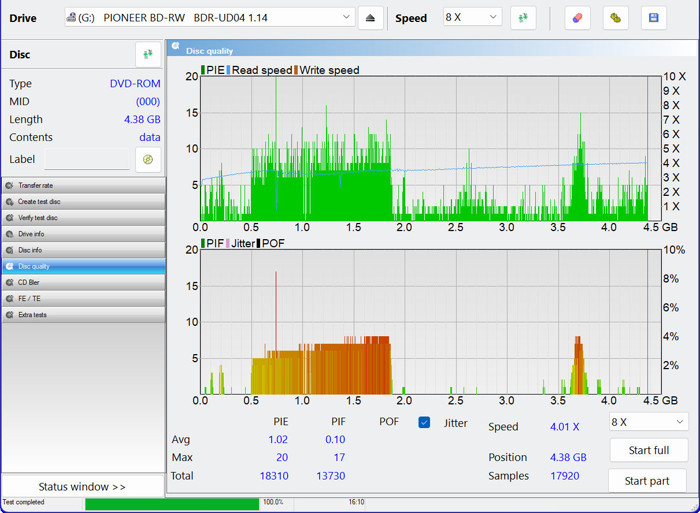 Scanning the ABEX TDR-821, show a significant number of errors (PIE/PIF), which however can be corrected from the drive's internal error correction abilities. PIE errors are kept low when the media is not scratched and got high peaks when the PIF errors are also high. No POF (unreadable area) was reported.