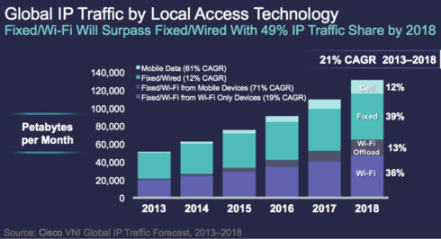 Over the past few years, we’ve seen and reported a significant rise in mobile data traffic. The figure below shows the growth of Wi-Fi and mobile (cellular) traffic in relation to traffic from wired devices. By 2018, Cisco says wired networks will account for 39% of IP traffic, while Wi-Fi and mobile networks will account for 61% of IP traffic. In 2013, wired networks accounted for the majority of IP traffic at 56%, Wi-Fi accounted for 41%, and mobile or cellular networks accounted for 3% of total global IP traffic. arriers of all sorts (i.e., mobile, cable, telco) are developing Wi-Fi strategies to reduce the burden on 3G/4G networks (enabling Wi-Fi offloading) and also to extend the reach of their content to subscribers beyond their residential environments (via public hotspots).