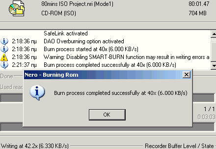The following picture is from Nero after a successful burning of Waitec Frisby II at 40X, SmartBurn enabled.