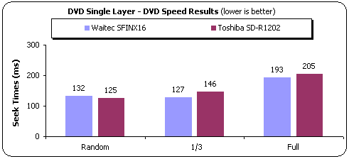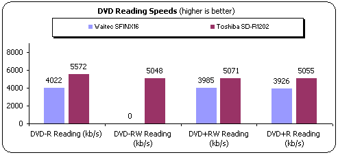 In the above chart you can see the average reading speed of both drives when various DVD writable media were inserted. The Toshiba SD-R1202 was faster than Waitec SfinX with all the available DVD formats. Notice than the Waitec drive failed in the DVDSpeed test with DVD-RW media. The drive recognized the disc contents but gave a read error during the test.