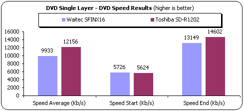 We ripped the same DVD movie to the HD for both drives. Waitec SfinX gave a high ripping speed but the Toshiba drive was even faster with 9109kb/s (average).