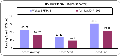 For the RW tests, we used Ricoh's HS-RW media. Waitec SfinX 16 is definitely faster than Toshiba SD-R1202 and gave a 23x average reading speed.