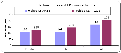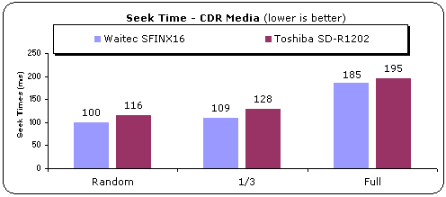 In the CD-R media reading test, both drives were faster than in the pressed CD test, and Waitec is still slightly faster than the Toshiba drive.