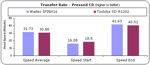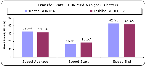 Using Nero CD Speed 0.85g, we measured the transfer rate of the drive. We compare the performance of Waitec SfinX16 with another CD-RW/DVD combo, the Toshiba SD-R1202. The average reading speed for Waitec is 31.73x, where Toshiba is a little slower.