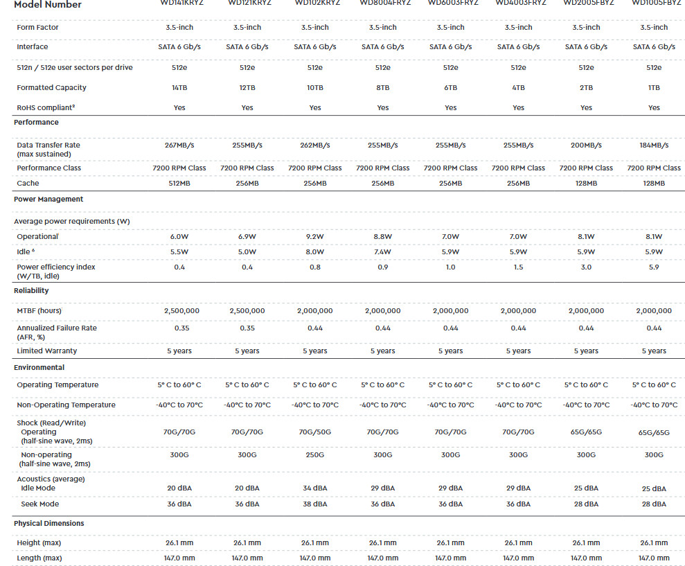 The WD Gold product line offer a workload handling capability of 550TB per year, reliability of up to 2.5M-hour MTBF, and are backed by a 5-year limited warranty.