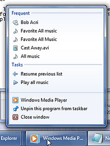 In Windows 7 Taskbar, every program/folder thumbnail is packed with a close icon and optionally some extra options like in windows media player whose thumbnail is enhanced with pause/play,pervious and next track butons. Furthermore, right-clicking on a minimized program will show us the Jump List. The Jump list has some extra application features. For instance, in Windows Live Messenger you can sign in or out, in Windows Explorer you can see the most visited locations, etc.