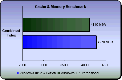 Combined Index: is a composite figure representing the overall performance rating of the entire Cache-Memory performance in terms of MB/s. The value is a result of the logarithmic average of all the results for the entire address space.Here we notice a small lead for windows XP x64