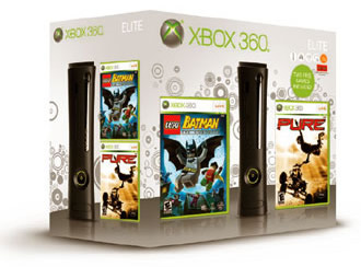 The Xbox 360 Elite Holiday Value Bundle includes a premium Xbox 360 Elite console and two games the whole family can enjoy - at no added cost. Enjoy making your way through Gotham City by building, driving, swinging, and fighting in Warner Bros. These games include Interactive Entertainment's LEGO Batman and PURE, a quad-based action sports game from Disney Interactive Studios. The concsole also packs a 120GB hard drive to download and stream movies, TV shows and Game Add-ons. The Xbox 360 Elite Holiday Value Bundle ships to retailers today and will be available for $299 (U.S. ERP).