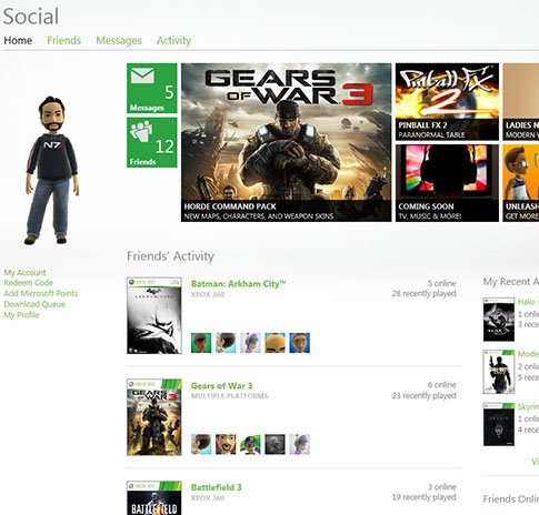 At the top of the social page, you'll a group of tiles and links to Xbox LIVE events, previews of the hottest new items on Marketplace, new video and game releases, Gamer Spotlight, and more. To the left of these are quick links that show you how many friends are online, and how many messages you currently have.