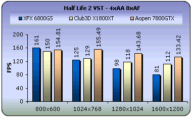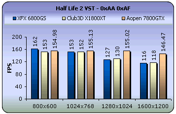 Since the game is very CPU dependent, it is better to ignore results taken at 800x600 and 1024x768 resolutions. The true value of a VGA card is best seen at higher resolutions with HL2. That is, at 1280x1024 and at 1600x1200 gaming resolutions. But again, while the 7800GTX card is alone at the top, the 6800GS battles it out with ATI's X1800XT once again.