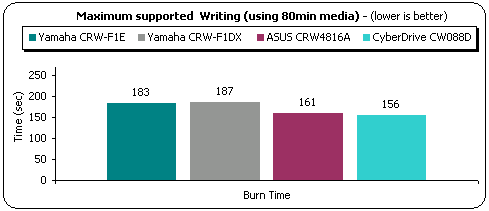 YAMAHA CRW-F1DX finished the writing process in 3:07 minutes. The result came with the IEEE1394 interface, with Sanyo Digital 80min 24X media. With USB2.0 interface the best result we had was 3:08mins. The drive is equal fast in both IEEE1394/USB2.0 interfaces. The YAMAHA CRW-F1E was faster in our tests by 4secs and CyberDrive CW088D leads the race at 48X with 156 seconds.