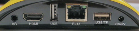 All ports are located at the back with a 3.5mm AV jack, HDMI 2.0 output, one USB port, an Ethernet port, another USB port, a micro SD slot, and the DC jack.