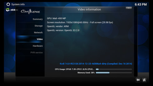 The player supposedly uses a hardware-accelerated KODI that can support up to 4K H.265 video playback. The box comes with Kodi 14.0-RC3 Zidoo edition and the interface runs at 1920x1080@60Hz. Probably Zidoo needs to upgrade this to the latest 14.1 builds: